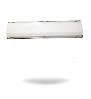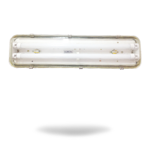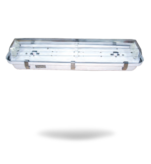Vibration resistance and drip proof engine room light fitting suitable for 2 x 20W. 230V. 50hz fluorescent tubes arranged side by side. The fitting made from Fibre body & provided with clear one piece acrylic cover is firmly secured to the housing with stainless steel toggles and fitted with rubber gasket to make totally insect free. The fitting provided with 2 nos. 20W copper polyester filled ballasts, power factor improvement capacitor, starter, lamp holder, 2 nos. cable entries, Brass glands etc. Duly wired up to a suitable connector with provision for earthing. 2 nos. MS brackets provided with lining for vibration mounting. |